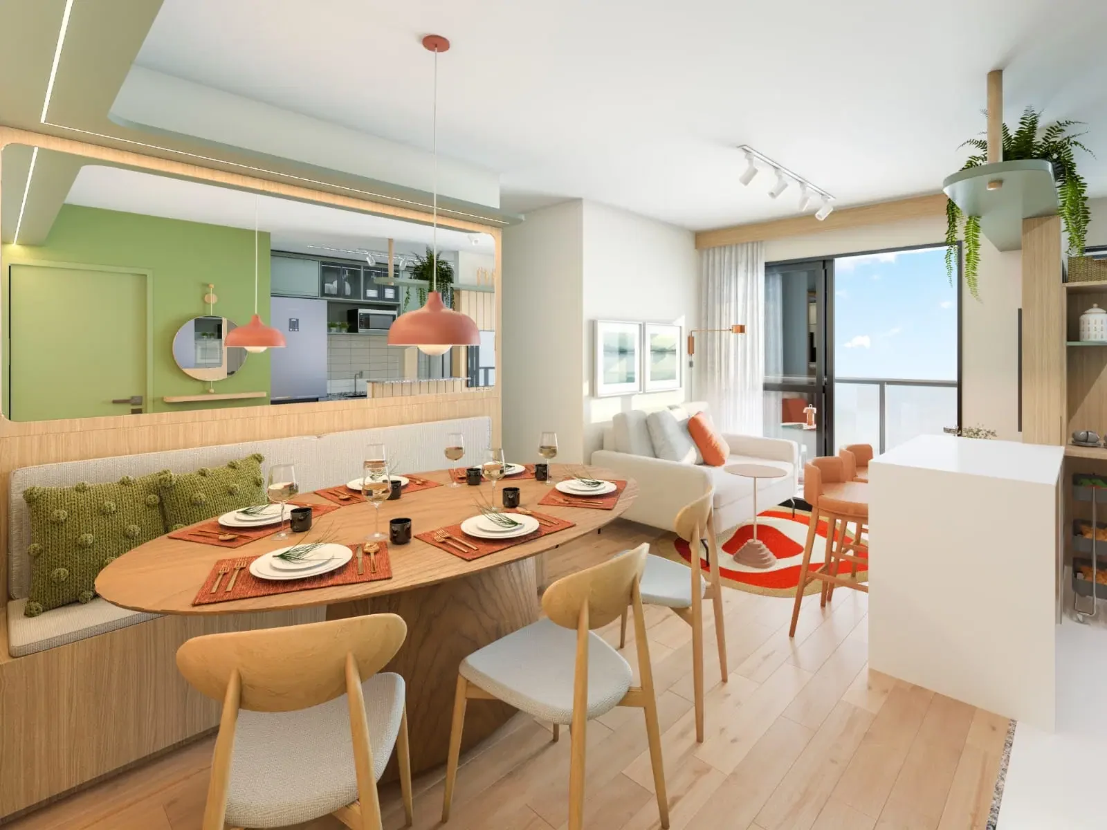 * Configuração: Sala de estar/jantar integrada à cozinha e área de serviço, varanda com guarda-corpo de alumínio e vidro.