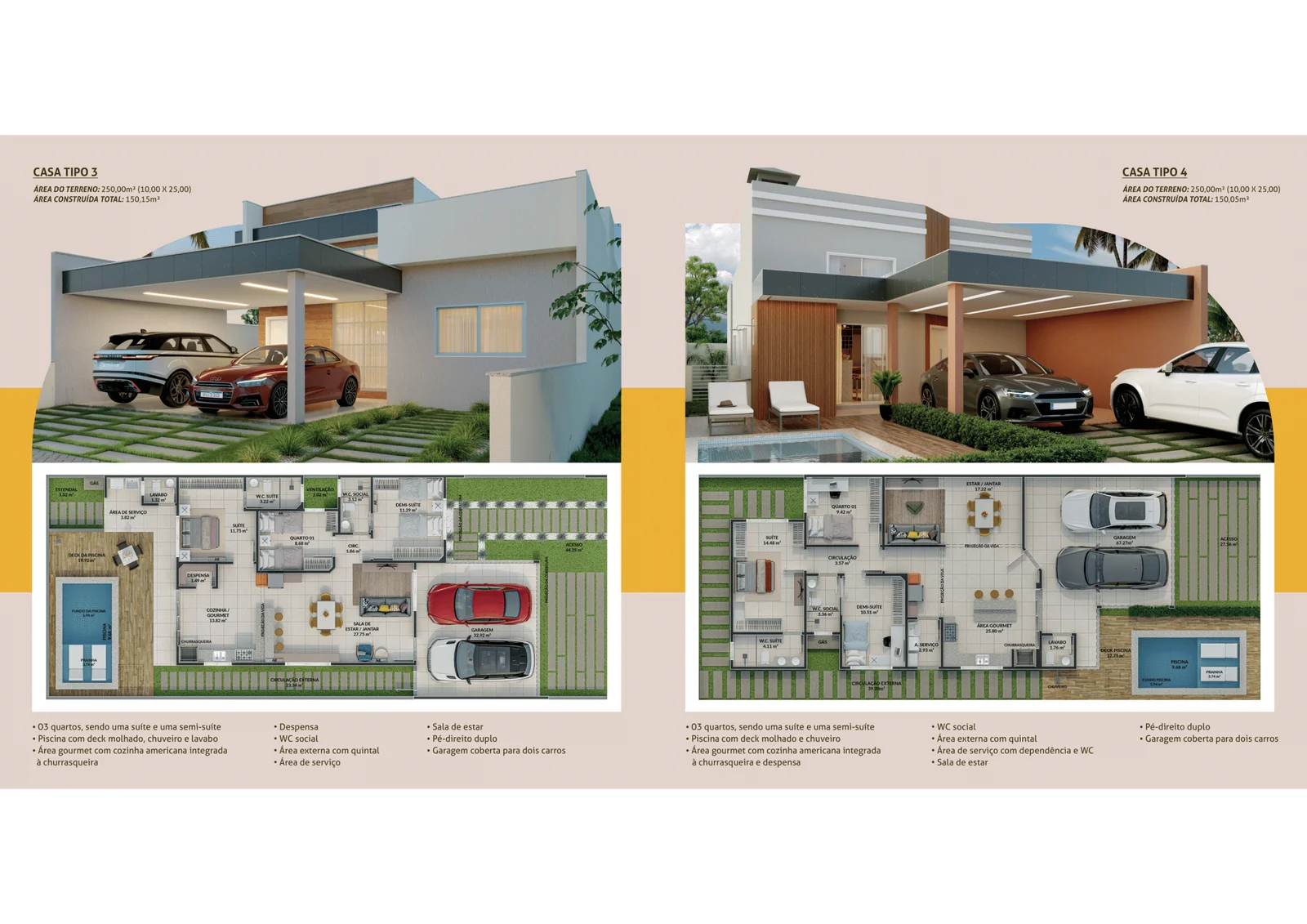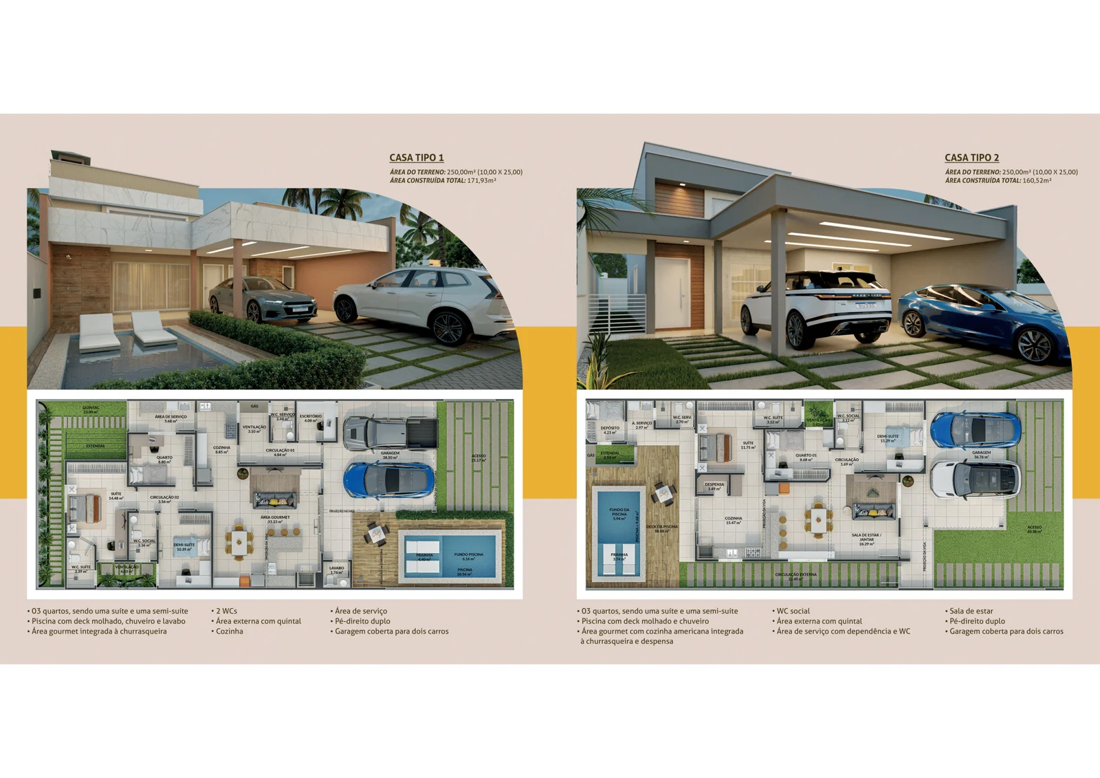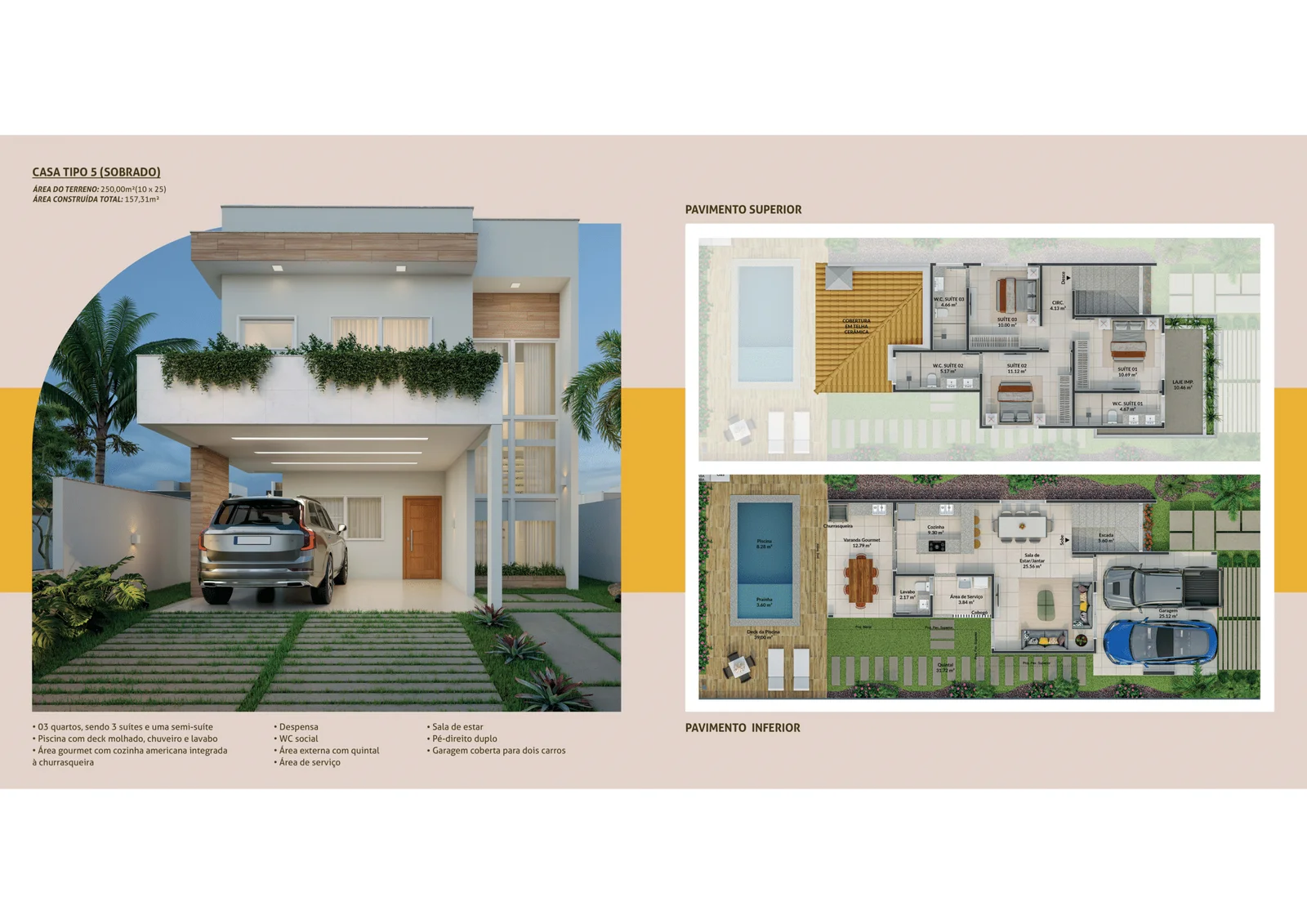 * Diferenciais: Pé-direito duplo, piscina privativa, área gourmet com churrasqueira, área de serviço.